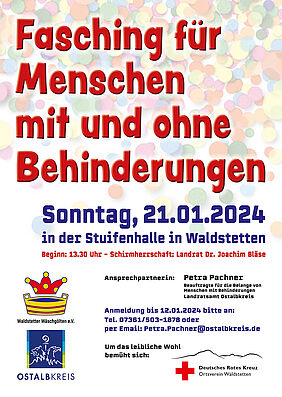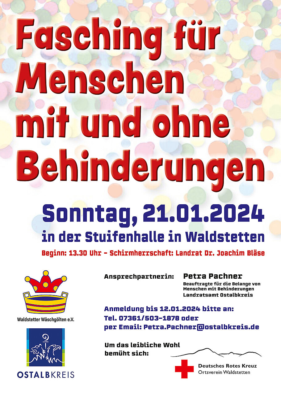 Auch in diesem Jahr veranstalten die Waldstetter Wäschgölten wiederum gemeinsam mit dem Landratsamt Ostalbkreis unter der Schirmherrschaft von Landrat Dr. Joachim Bläse den "Fasching für Menschen mit und ohne Behinderungen" am 21. Januar in der Stuifenhalle in Waldstetten.